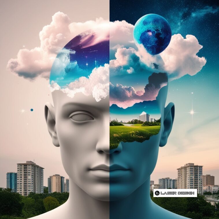 An abstract visual of a human head with dreamlike elements such as clouds, stars, or surreal landscapes blending into the real world (like buildings or nature scenes), representing the confusion between reality and fantasy Wall Sticker and Theme Background. File size 457 KB and 896×896.