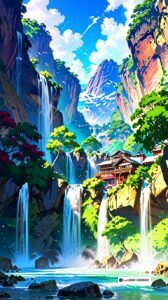 Free Vector beautiful landscape mountains and waterfalls Anime Illustration Theme