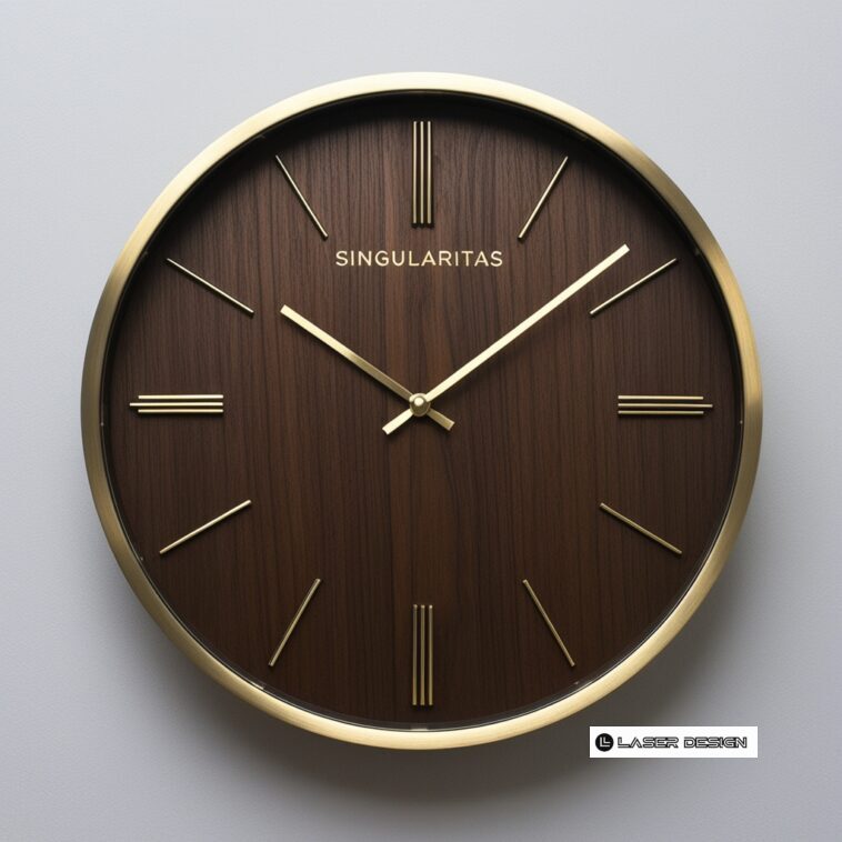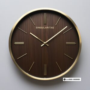 The file ‘Free Vector round clock framed by a circular brass rim’ is (.cdr) file type, The dial with the deepest, purest wood structure , with no decorative elements except for the word ‘Singularitas’ displayed. The brass hands should be of a perfectly simple design.