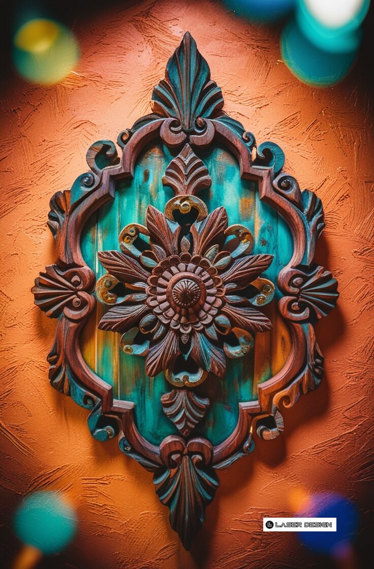 a highly detailed, vibrant, and surreal cinematic photograph of unique, handcrafted wooden wall decor, featuring intricate carvings and ornate patterns, set against a warm, richly textured background, with deliberate film grain and subtle lens flares, evoking a sense of nostalgia and wonder with hues of emerald green, turquoise, and amber, reminiscent of a bygone era, with a mystical, dreamlike quality. File size 718 KB and 736 x 1120px.